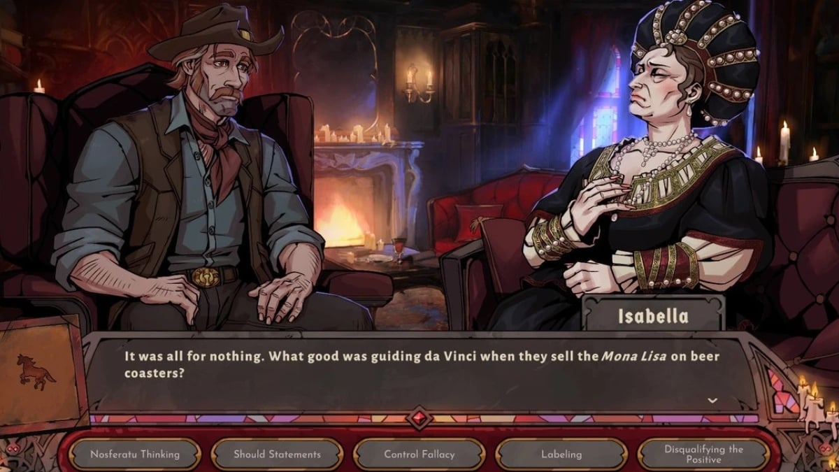 Those questions became the backbone of Vampire Therapist. Vampires were a natural fit as immortality makes them the perfect vessels for exploring emotional stagnation, trauma, and change. As a history buff himself, Nemati also wanted a framework that could connect the game’s characters to history in a meaningful way. He started with a punchline, and then worked backward to find a historical figure to support it. In one case, that meant building a character around a hatred for Star Wars: The Rise of Skywalker and landing on Renaissance patron Isabella d’Este.