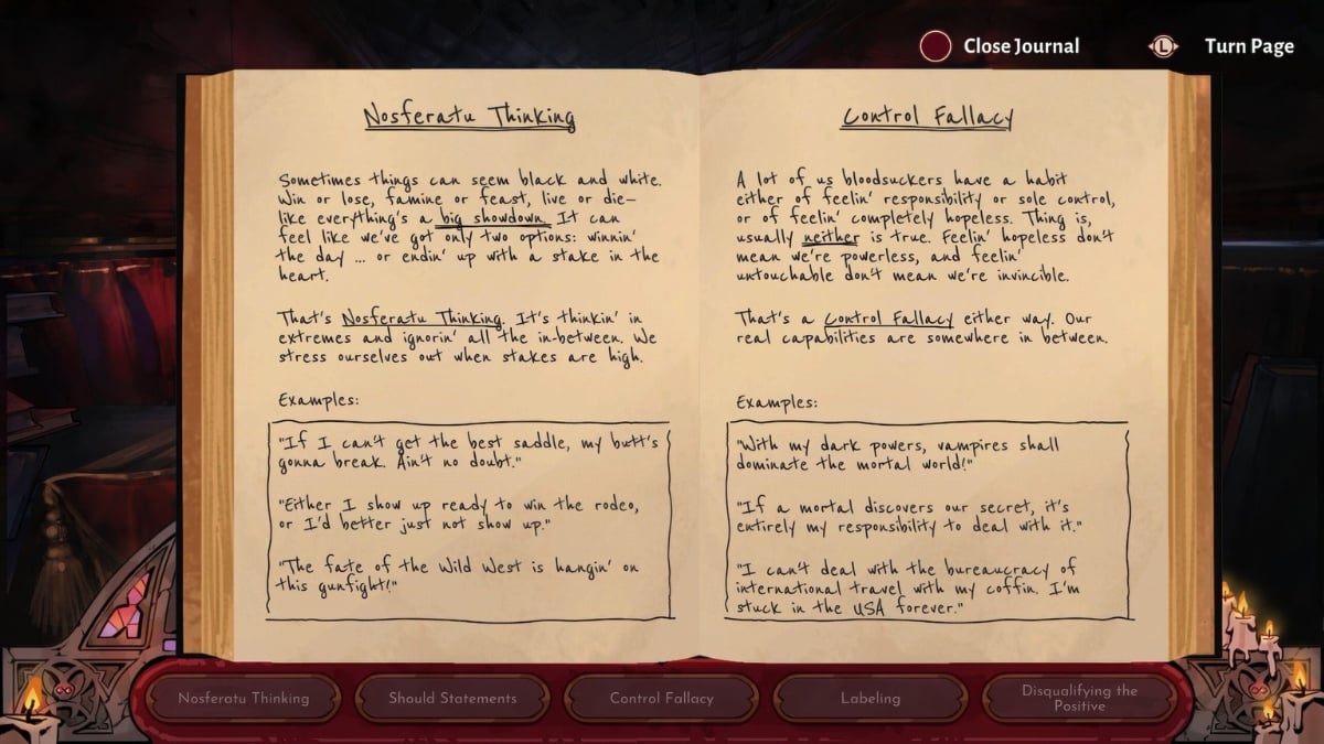 Vampire Therapist’s most important collaboration, however, was with licensed therapists. Nemati says the partnership was essential in creating Sam’s journal, which explains cognitive distortions and gives players examples to identify during each scene. He notes that creating the journal was one of the biggest challenges — not because the material was impossible to understand, but because it had to be clear, precise and non-ambiguous for the player.