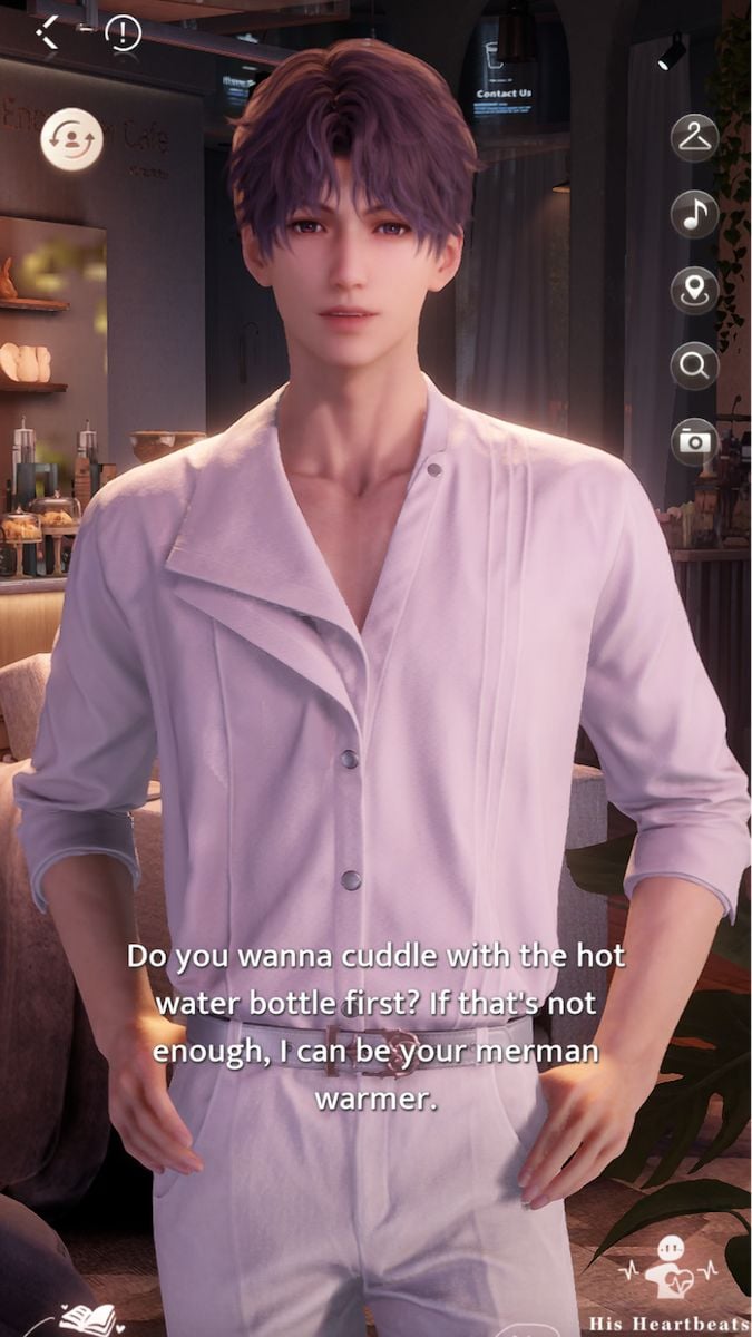 While you still act as your character, it blurs the line between fantasy and reality through the interactions in Destiny Café. The simple interactions include tapping on your love interest to find out what they’re thinking, and touching various body parts results in different responses. For example, tapping the top of his head will have him asking for more because head pats feel nice, while tapping his midsection may have him tell you that’s not where he’s ticklish.