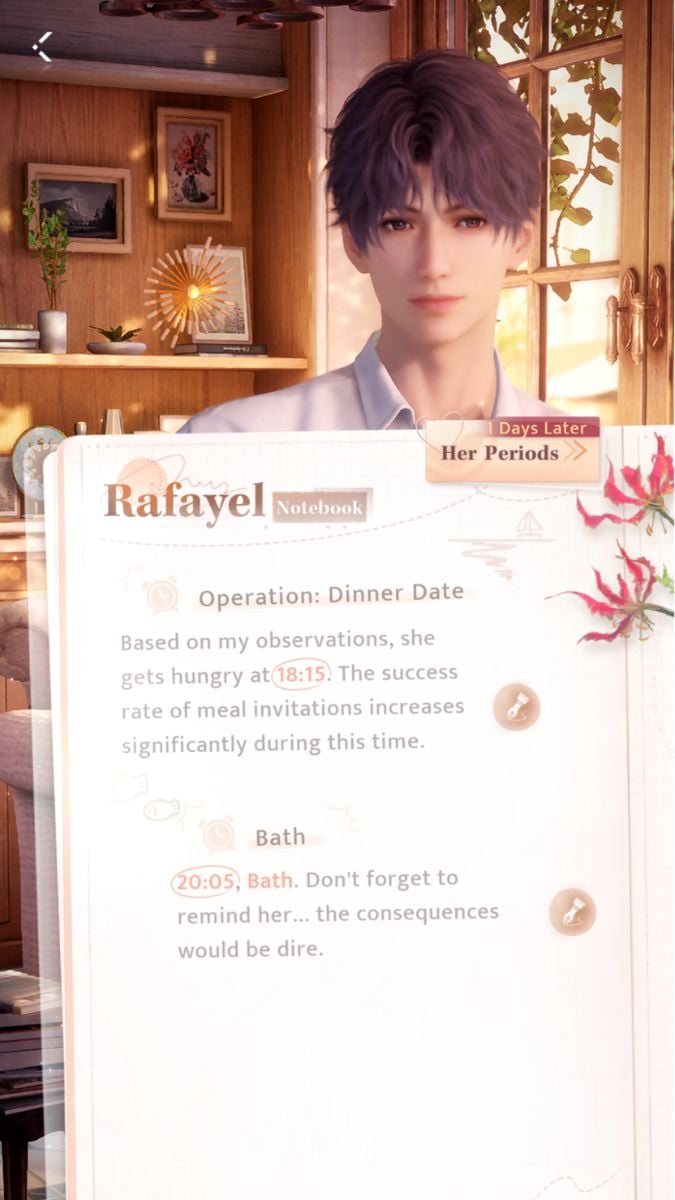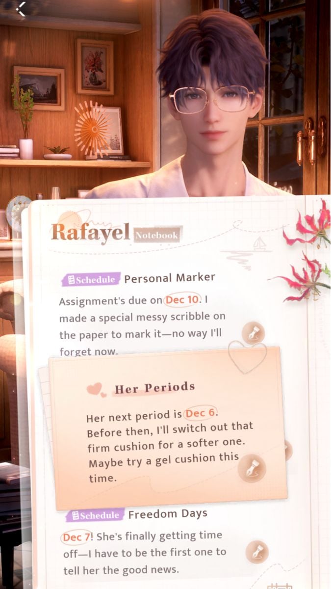 Throughout the week, Rafayel would check in on me whenever I tapped on him at Destiny Café, asking if I’m hungry or if I would like to rest more. There was even one interaction where he asked if I needed any pads or tampons, though he doesn’t actually leave Destiny Café. In the Notebook, Rafayel also has a tab titled “Her Periods”, where he predicts when my next period will be, as well as a note on what to prepare for next time.